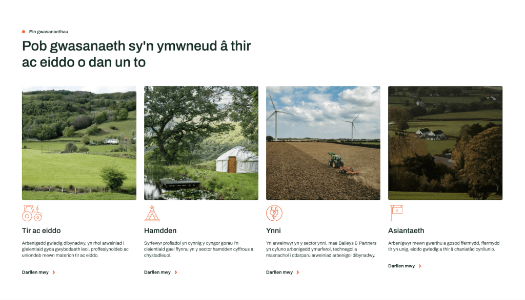 Mae’n dod a’n holl ystod o wasanaethau at ei gilydd, yn cyflwyno’r tîm, ac yn darparu man cychwyn clir ar gyfer sgyrsiau, p’un a ydych chi’n gleient hirdymor neu’n ymgysylltu â Baileys am y tro cyntaf.